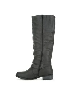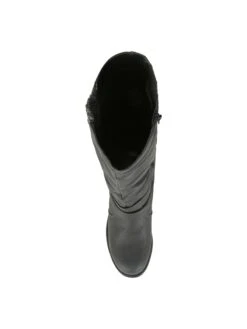 - Faux leather upper in a tall boot style with a round toe